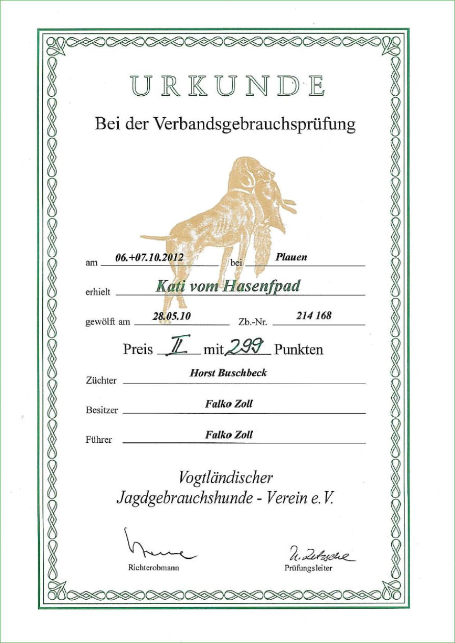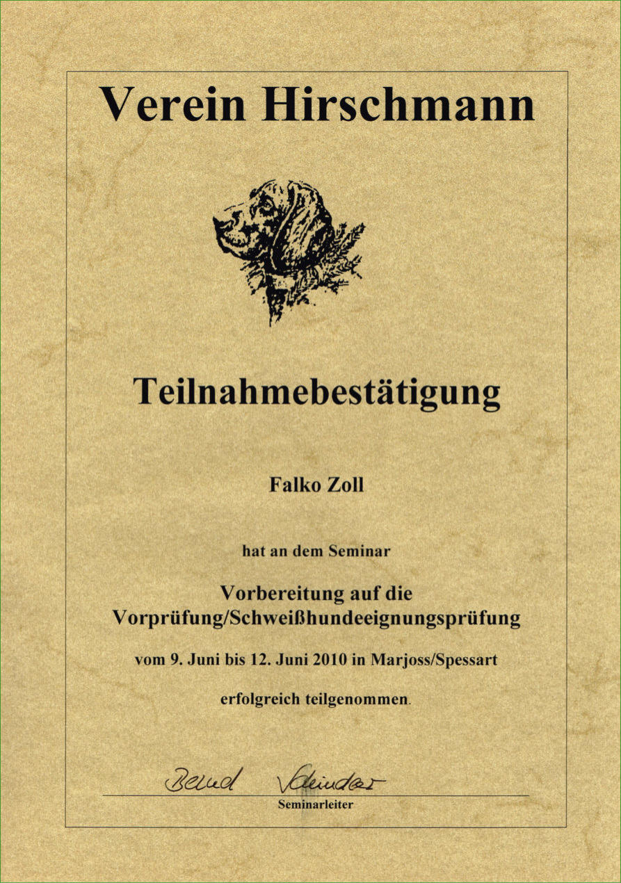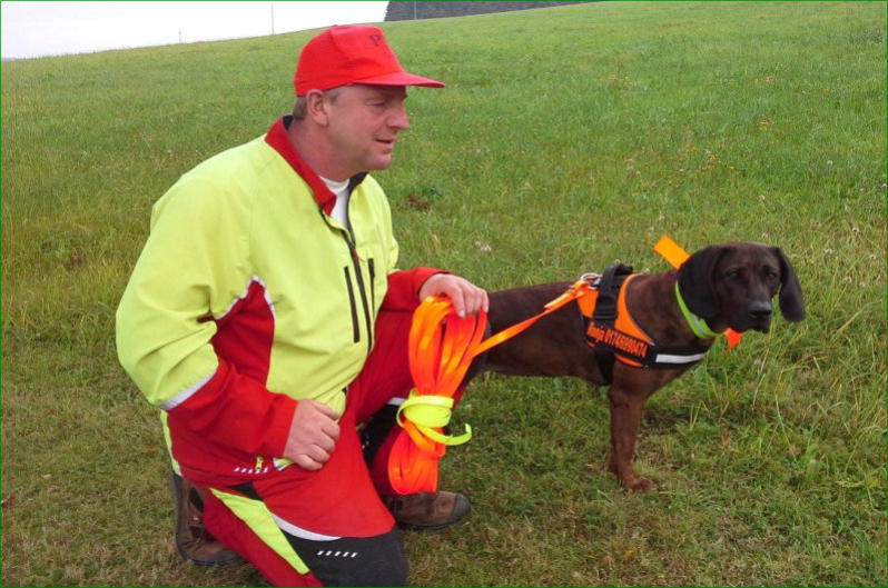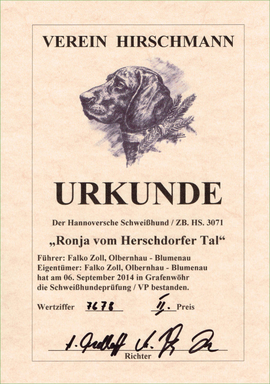 Ronja wird in nächster Zeit in ihren wohlverdienten Ruhestand gehen. Schweißhündin „Ronja vom Herschdorfer Tal“Seit Mai 2013 bin ich im Besitz der Hannoverschen Schweißhündin „Ronja vom Herschdorfer Tal“, die am 06. September 2014 in Grafenwöhr ihre Schweißhundeprüfung / VP erfolgreich abgeschlossen hat. Ronja steht ab sofort für anfallende Nachsuchen zur Verfügung. Um die Nachsuchen gut zu planen, gebe ich folgende Tipps an Jäger:-Anschuss verbrechen (Nicht nachgehen)-Anruf: 037363/7816 oder 0174/6990474-Treffpunkt vereinbaren-Absprache NachsucheDer Erfolg einer Nachsuche hängt vom richtigen Verhalten nach dem Schuss oder nach einem Verkehrsunfall ab. Ich wünsche eine gute Zusammenarbeit und Waidmanns heilFalko ZollSchweißarbeit ist aktiver Tierschutz!