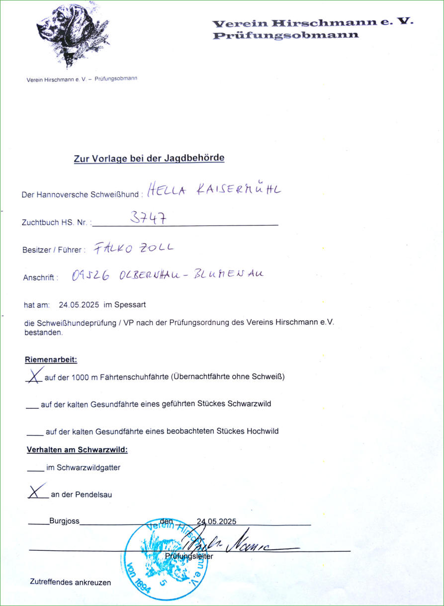 Schweißhündin „Hella Kaisermühl“Seit Juni´2024 bin ich im Besitz der Hannoverschen Schweißhündin „Hella Kaisermühl“, die am 24. Mai´2025 im Spessart ihre Schweißhundeprüfung VP erfolgreich abgeschlossen hat. Hella steht ab sofort für anfallende Nachsuchen zur Verfügung. Um die Nachsuchen gut zu planen, gebe ich folgende Tipps an Jäger: -Anschuss verbrechen (nicht nachgehen)-Anruf 037363/7816 oder 0174/6990474-Treffpunkt vereinbaren-Absprache NachsucheDer Erfolg einer Nachsuche hängt vom richtigen Verhalten nach dem Schuss oder nach einem Verkehrsunfall ab. Ich wünsche eine gute Zusammenarbeit und Waidmanns heil.Falko Zoll Schweißarbeit ist aktiver Tierschutz!